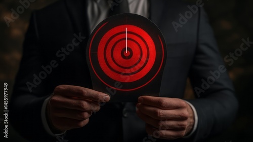 business, professional, focused, target, graphic, hand, holding, black, red, dark, image, person, man, suit, attaching, design, conceptual, visual, strategy, goal, aim, success, opportunity, direction, achievement, presentation, marketing, planning, leadership, decision, power, control, future, objective, vision, action, photo, modern, businessman, portrait