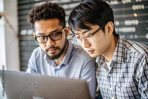 collaboration, teamwork, colleague, diverse, professional, business, office, laptop, computer, technology, working, sharpened, concentrated, discussion, brainstorming, project, partnership, startup, innovation, meeting, workplace, casual attire, modern, young, man, male, asian, african american, black, goggles, screen, cyberspace, digital, datum, analysis, strategy, planning, productivity, solution, development, communication, conversation, engagement, idea, creative, design