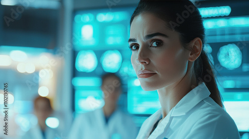 focused female hospital administrator in modern medical environment, showcasing determination and professionalism. background features advanced medical technology and screens