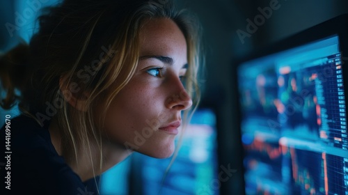 Focused Female Investor Analyzing Stock Market Data on Computer Screens