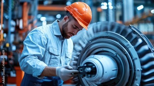 engineer, mechanic, technician, male, man, person, men at work, industrial, factory, plant, machinery, equipment, technology, engineering, maintenance, repair, inspection, turbine, engine, part, component, metal, steel, blue, orange, concentrated, focused, serious, hard work, precision, detail, glove, helmet, safety, uniform, manufacturing, industry, workshop, professional, skilled, expertise, jet engine, power generation, closeup, concentrating