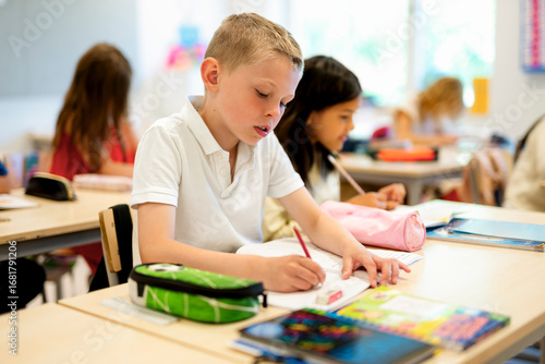 casual clothes, children, childhood, blonde hair, crayons, book, pupil, europa, girl, photo, color image, togetherness, elementary school, goteborg, horizontal, learning, indoor, classroom, communication, cognition, class, reading, boy, selective focus, sitting, scandinavia, school, school supplies, schoolboy, desk, student, studying, sweden, education, friendship