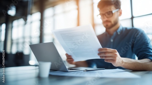 man, reviewing, document, desk, laptop, office, work, business, paperwork, reading, sharpened, concentrated, professional, employee, men at work, adult, male, person, hand, paper, file, information, datum, analysis, study, research, planning, strategy, job, career, task, project, goal, success, achievement, technology, computer, digital, modern, lifestyle, indoor, workplace, businessman, entrepreneur, serious, attentive, goggles, shirt, table