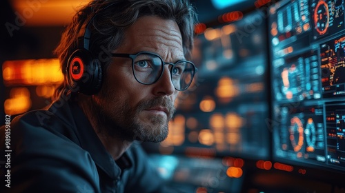 man, computer, technology, work, sharpened, screen, desk, office, digital, datum, workplace, network, programming, code, analyst, developer, engineer, programmer, monitor, desktop, keyboard, goggles, earphones, serious, focused, confident, professional, business, modern, futuristic, concentrated, task, thinking, problem, solution, tech, innovation, art, design, user, interface