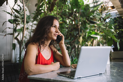 Focused middle-aged woman in red dress on a phone call while working on a laptop in a lush, green café. Surrounded by nature-inspired decor, reflecting a relaxed yet productive remote work atmosphere