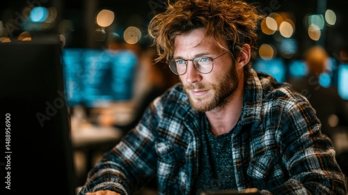 man, goggles, computer, workspace, office, night, bokeh, light, technology, work, concentration, professional, indoor, screen, desk, job, career, business, people, male, eyewear, casual attire, modern, digital, datum, analysis, programming, coding, software, developer, engineer, tech, industry, productivity, focused, serious, thoughtful, contemplative, creative