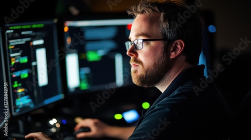 Focused Programmer Working Late at Night in Dimly Lit Office