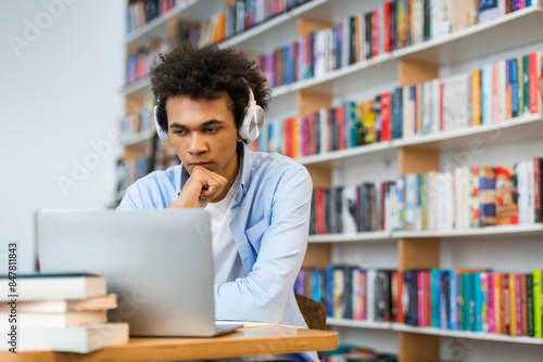 Focused sad latin student guy sitting in front of laptop in university library, poignant scene capturing the challenges and fatigue of academic endeavors
