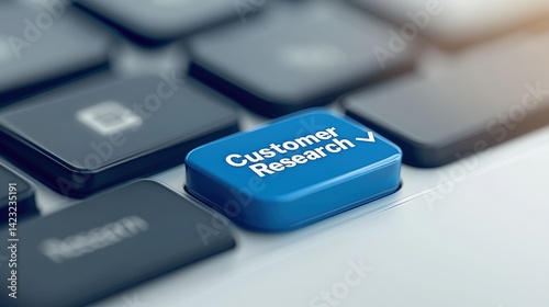Focused View of a Single Blue Keyboard Key with Customer Research Text Emphasizing Importance of Data Analysis in Modern Business Strategies