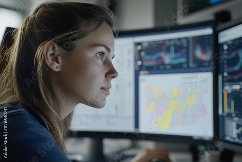 focused woman data analyst working in modern office, analyzing complex data visualizations and charts displayed on multiple computer screens