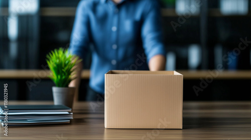 Focused worker organizing personal belongings into a box, a mix of books, a small plant, and a farewell card visible on a wooden desk.
