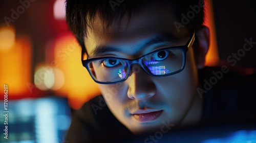 man, young, focused, analysing, datum, digital, screen, high technology, environment, vibrant, lighting, futuristic, ambience, technology, information, work, office, modern, professional, business, design, innovation, research, analysis, concentration, monitor, media, visualisation, background, creativity, teamwork, corporate, cyberspace, lifestyle, success, motivation, development, dashboard, statistic, growth, productivity, intelligence, software, visual, concept