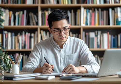 man, studying, writing, desk, library, book, bookshelf, student, education, learning, young, focused, notebook, goggles, reading, academic, workspace, cognition, bookshelf, pen, laptop, study, concentration, serious, modern, research, office, scholar, organised, paper, university, professional, indoor, educational, calm, homework, self-improvement, desk work, productive, thoughtful, preparation, background, quiet