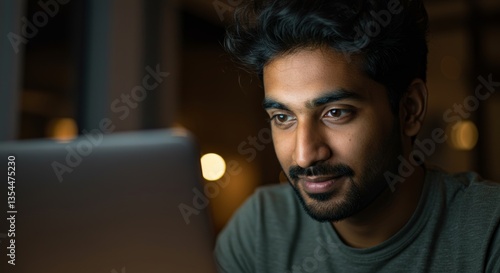 Focused young man working on laptop at night with concentrated expression