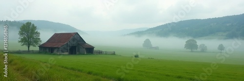 Fog enveloping serene countryside farm with old barns and rolling hills in the background, outdoors, rolling hills, farm