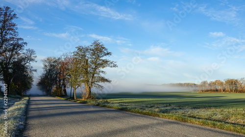 Fog on a farmers field. Yellow trees in autumn landscape. Road with avenue.