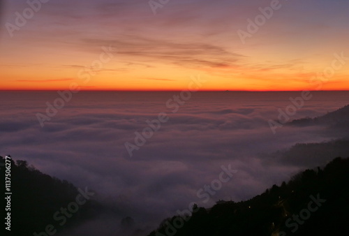 Fog on po valley at the sunset from Bergamo, Lombardy, Italy