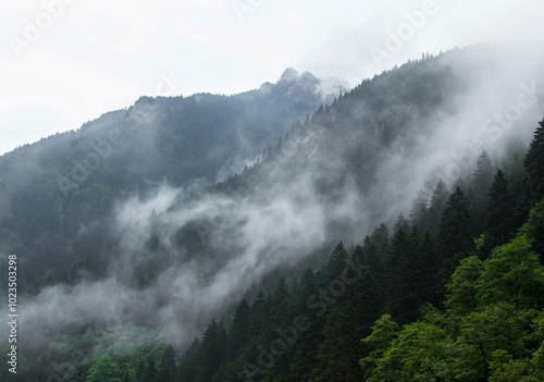 adventure, amazing, background, fog, forest, green, hike, hiking, hill, landscape, nature, mountain, cloud, cloud, sky, travel, tree, tree, view, weather, high, rain, summer, calmness, rainforest, mysterious, misty