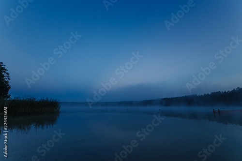 Fog over the lake, twilight over the lake, very dense fog, dawn, blue sky over the lake, the morning comes, the forest reflects in the water, surface water, clear morning sky, gothic, Grim picture