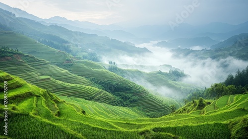 Foggy farmland in China with green rice fields. Farmers grow rice on terraced mountainsides. Picture of Asian agriculture.