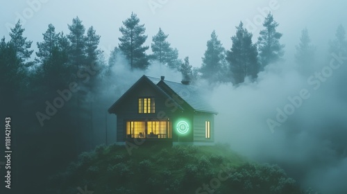 fog, house, night, tree, forest, hillside, light, window, wooden, cabin, remote, secluded, misty, atmospheric, serene, peaceful, dark, mysterious, cosy, illuminated, green, signs, silhouette, landscape, nature, solitude, scenery, quiet, tranquil