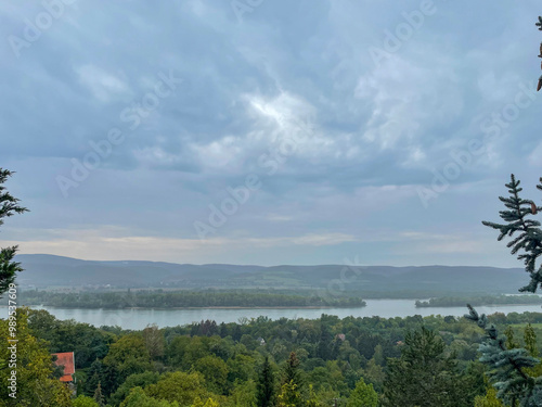sky, cloud, river, landscape, forest, view, background, blue, fog, chilly, cloud, morning, cloudy, cloudy day, cloudy sky, danube, foggy, grass, green, hungary, natural, nature, overcast, travel, tree, water, calm