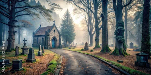 Foggy Stone Path to a Chapel in a Cemetery - Serene Atmosphere, Tranquil Landscape, Spiritual Journey, Mystical Vibes, Nature's Embrace, Peaceful Retreat