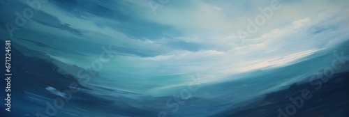 Foggy twilight blue morning mountain valley minimal landscape painting, thick cloud cover with barely visible horizon.