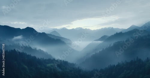 fog-kissed mountain range unveiling the enigmatic dance of shadows and light