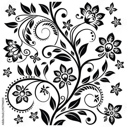 folk art, floral pattern, black-and-white, hand-drawn, floral background, illustration, eastern european