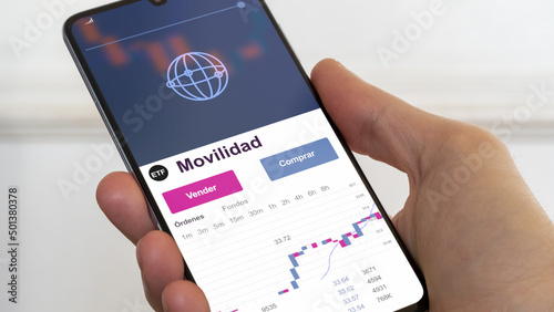 fondo de inversión negociado en bolsa mundial, Datos del mercado de valores en el teléfono. Análisis de negocios de una tendencia ETF Movilidad. Blue chips. Texto en español