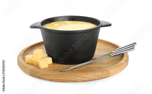 Fondue with tasty melted cheese, forks and pieces isolated on white