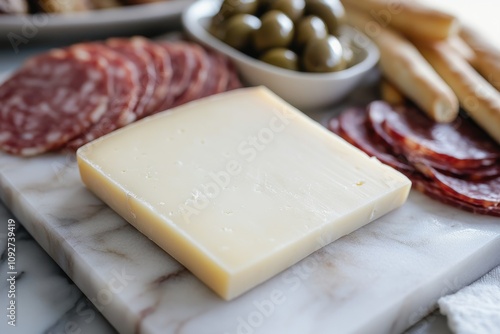Fontina Cheese with Charcuterie: Slices of fontina cheese arranged alongside cured meats