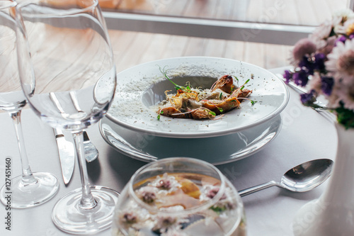 food, meal, dinner, plate, eatery, seafood, dish, salad, cooking, lunch, cookery, vegetable, meat, pasta, table, tomatoes, fish, delicious, epicure, shrimp, breakfast, glasses, sauce, healthy, grilled