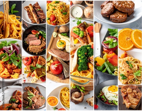 variety, meal, cooking, collage, illustration, food, dinner, various, meat, fresh, meal, cookery, eatery, beef, delicious, chicken, lunch, pasta, salad, dish, assortment, fast food, green, healthy, white, spaghetti, junk food, grill, background, set, eat, collection, tomatoes, object, bar, italian, bar-b-q, catering, plate, pork meat, tasty, banner, different, french fries