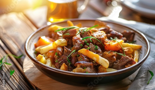Food in a wooden bowl, fries, meat and salad, with beer on the side, aesthetic shot, created with AI