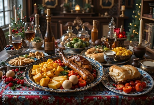 christmas, eve, dinner, table, feast, holiday, celebration, family, tradition, food, dish, festive, decorated, tree, ornament, light, candle, wine, beer, plate, bowl, silverware, tablecloth, joyful, gathering, togetherness, warmth, comfort, delicious