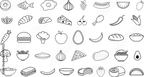 Food Outline Vector Icon Set | Restaurant, Fast Food, Drinks, Fruits, Vegetables & Kitchen Icons