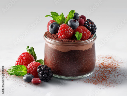 food photography of our Waldbeer-Schokoladenkuchen im Glas: Indulge in our irresistible creation in a jar - a moist chocolate cake with fresh berries and velvety smooth chocolate. A feast for the sens