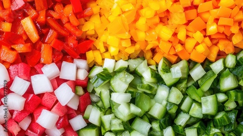 Food trends vegan concept. A vibrant arrangement of diced vegetables in red, yellow, orange, and green, showcasing fresh ingredients ideal for salads or cooking.