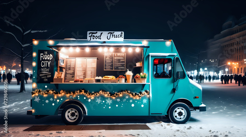 Food truck in the city festival winter night, photo shoot