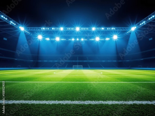 Football field under the brilliant blue-white illumination of stadium lights, frosty scene, sports equipment, cool atmosphere