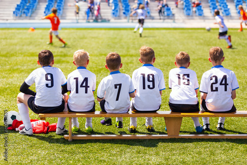 Football game for school boys. Kids waiting on the substitute bench.. School football team members in white jerseys. Children play football league at the stadium