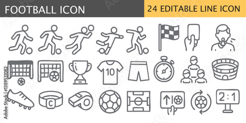 football, icon, vector, sport, soccer, illustration, game, ball, team, match, athlete, competition, championship, goal, equipment, field, stadium, player, uniform, kit, strategy, coach, fitness, training, cartoon, clip art, editable, symbol, graphic, collection, isolated, set, recreation, tournament, world cup, league, action, scoreboard, defense, offence, teamwork, succeed, sports equipment, goalpost, active