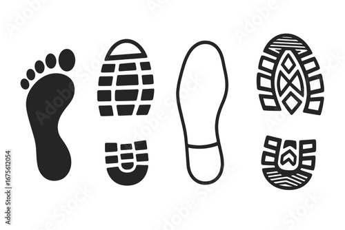 Footprint and shoe print vector icon set. Human barefoot silhouette, boot track, shoe sole patterns. People steps, walking trail, evidence, forensic, and detective concept.