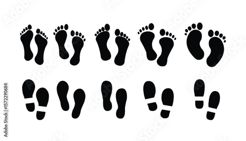 Footprint icon set. Barefoot footprints, shoe prints, child's footprints. Adults and children's steps - stock. vector.