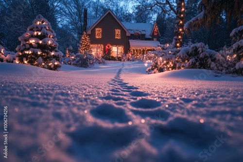 Footprints leading to warm christmas house in snow at twilight