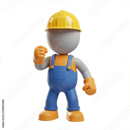 foreman faceless cartoon character In yellow construction helmet, in blue overalls and orange details, 3D render isolated on a white background