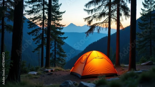 Forest Adventure. Orange Camping Tent Illuminated at Dusk in Mountain