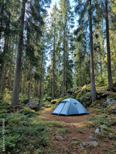forest, campground, tent, tree, sunlight, nature, outdoors, hiking, camping, scenery, peaceful, tranquil, lush, green, wood, grey, rock, ground, moss